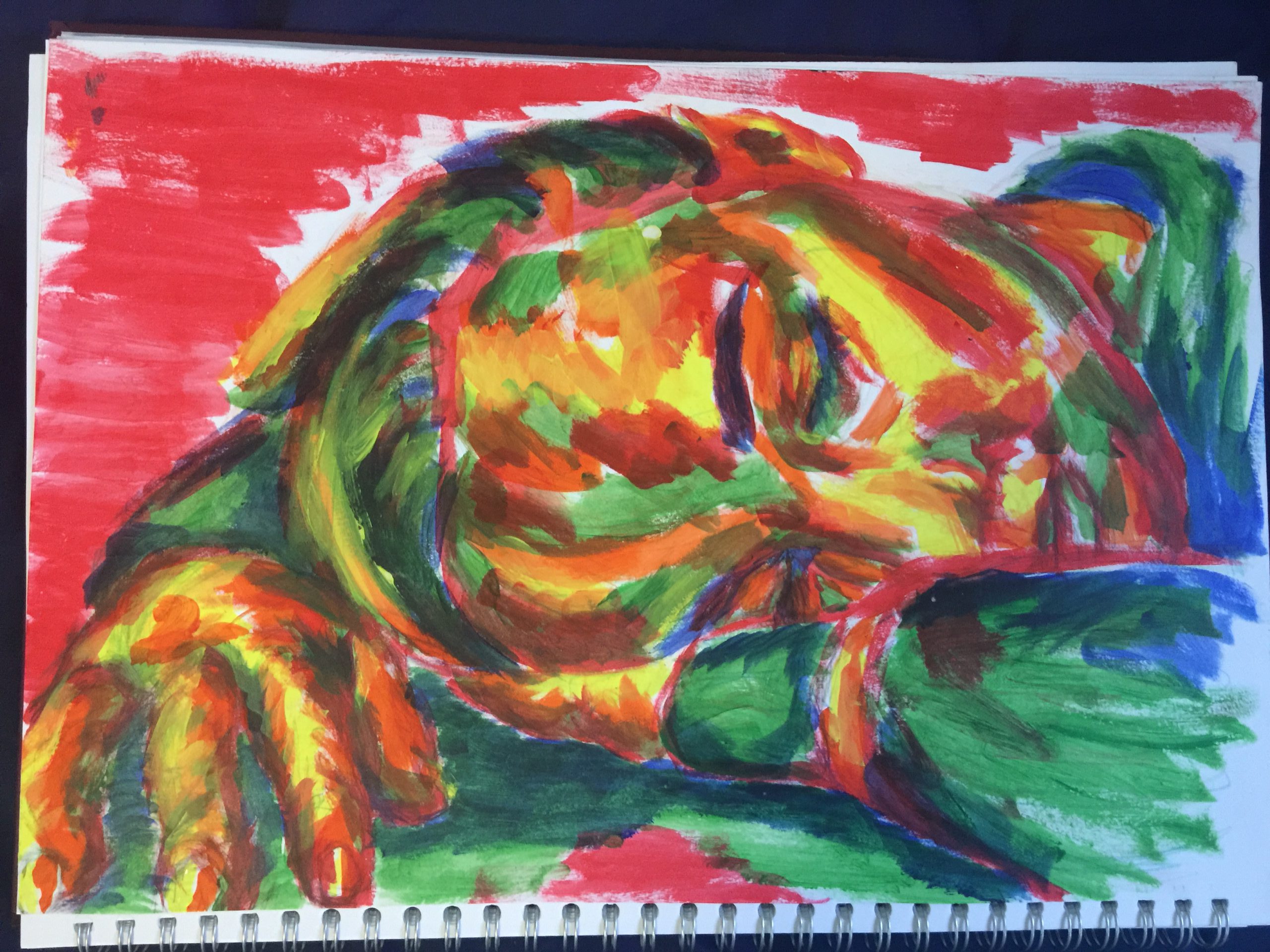These are two portraits I completed using a restricted colour palette of yellow, orange, red, green & blue. The larger of the two is roughly A2 in size. Acrylic Paint on paper. This second painting is another of the sleeping portrait series using this restricted colour palette. I really liked the vibrancy of the original so I decided to add a red background to make the whole piece pop even more.
