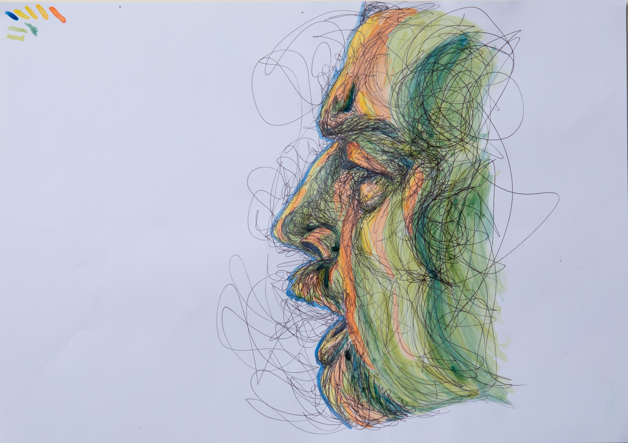 This is a collage composition that was made from small cut-out sections of biro drawings of my Dad. I used ink within some of the sections, with orange in the highlights and green/blue in the contours.This was an original biro & ink drawing that became this composition.